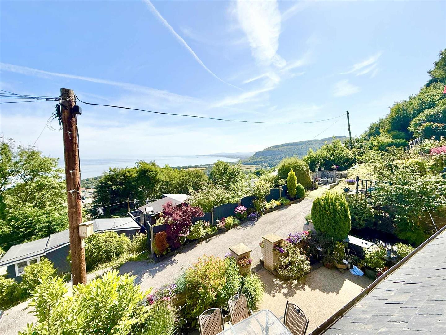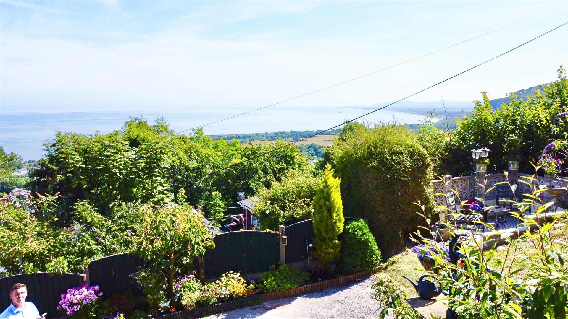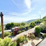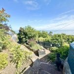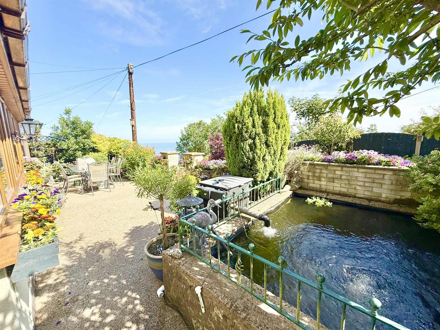 Outside, the home continues to impress. To the front, a beautifully enclosed patio area with a pond offers a serene space for relaxing or alfresco dining. Steps lead up to a tiered garden where a delightful sun house awaits—a peaceful hideaway with its own balcony, perfectly positioned for enjoying a glass of wine as the sun sets over the sea.