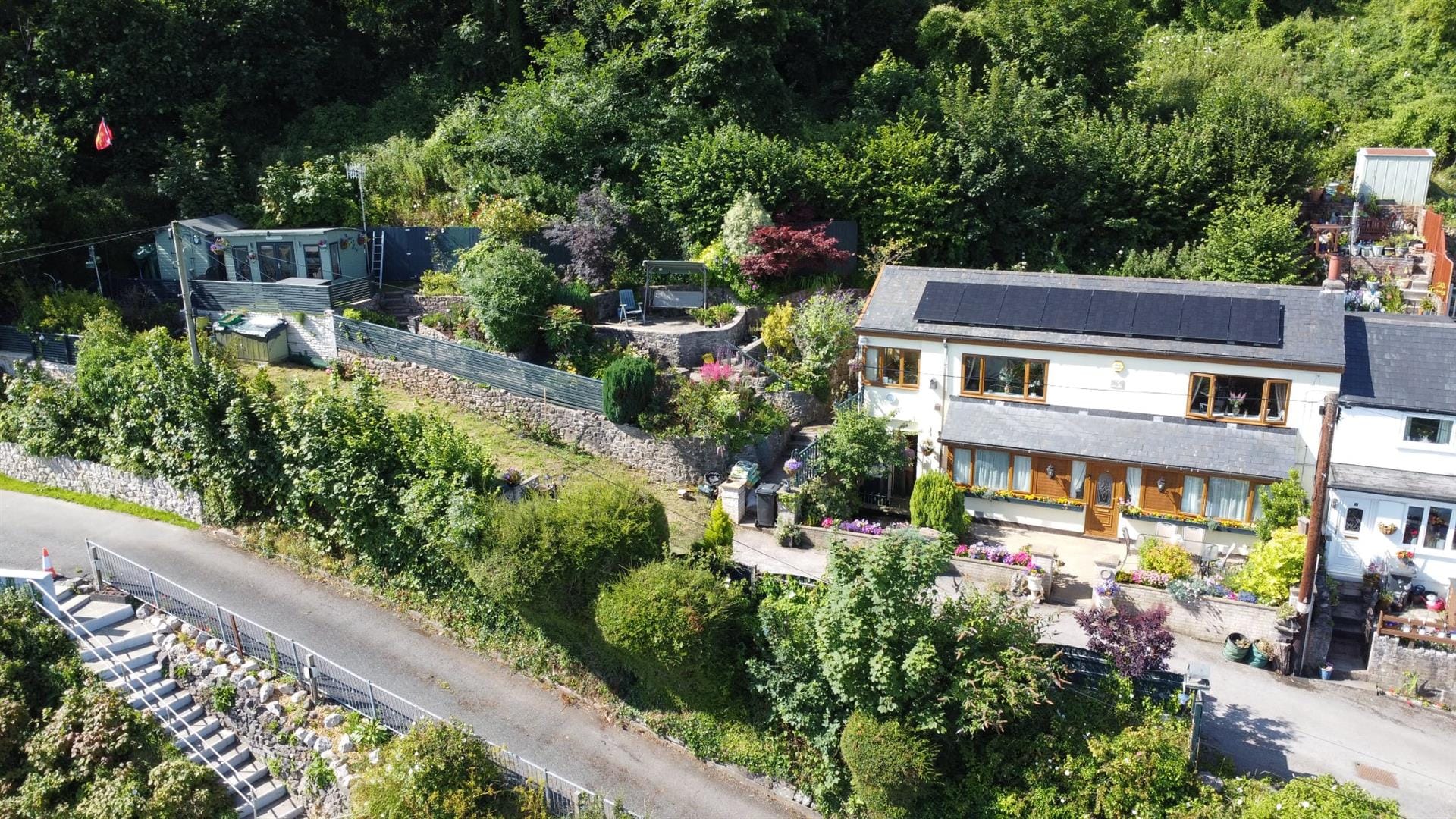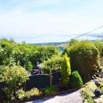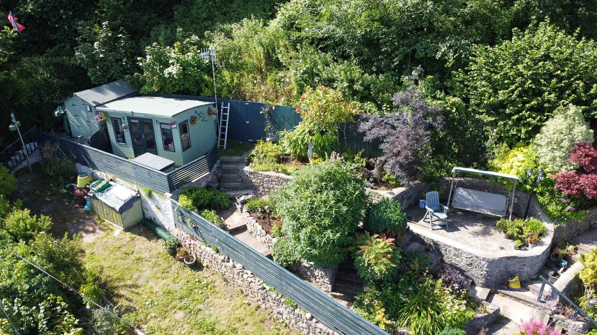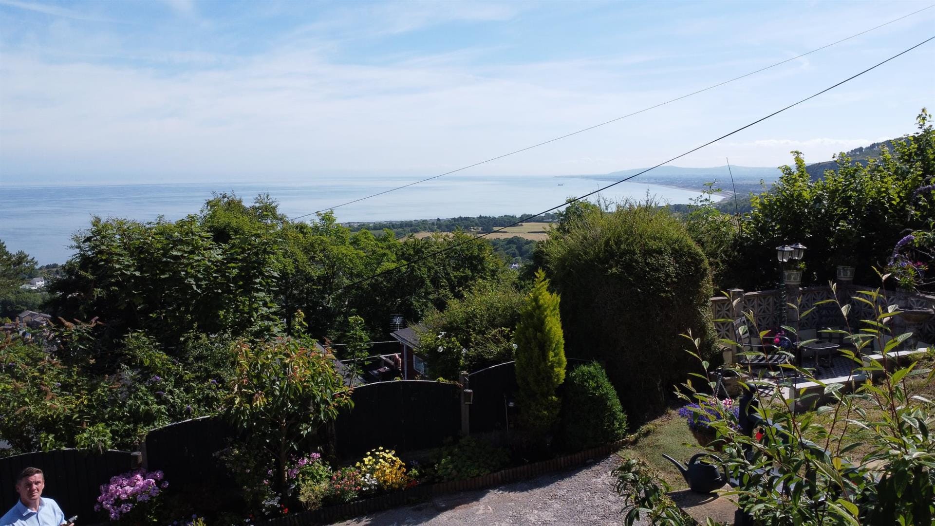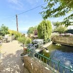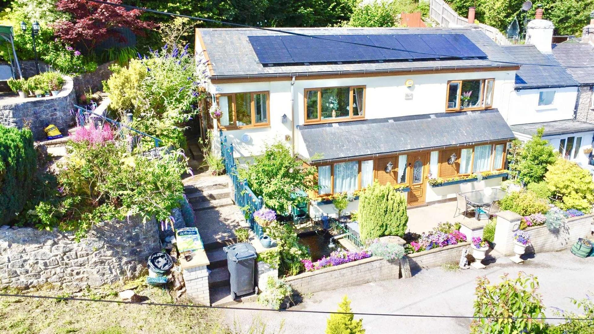 Outside, the home continues to impress. To the front, a beautifully enclosed patio area with a pond offers a serene space for relaxing or alfresco dining. Steps lead up to a tiered garden where a delightful sun house awaits—a peaceful hideaway with its own balcony, perfectly positioned for enjoying a glass of wine as the sun sets over the sea.