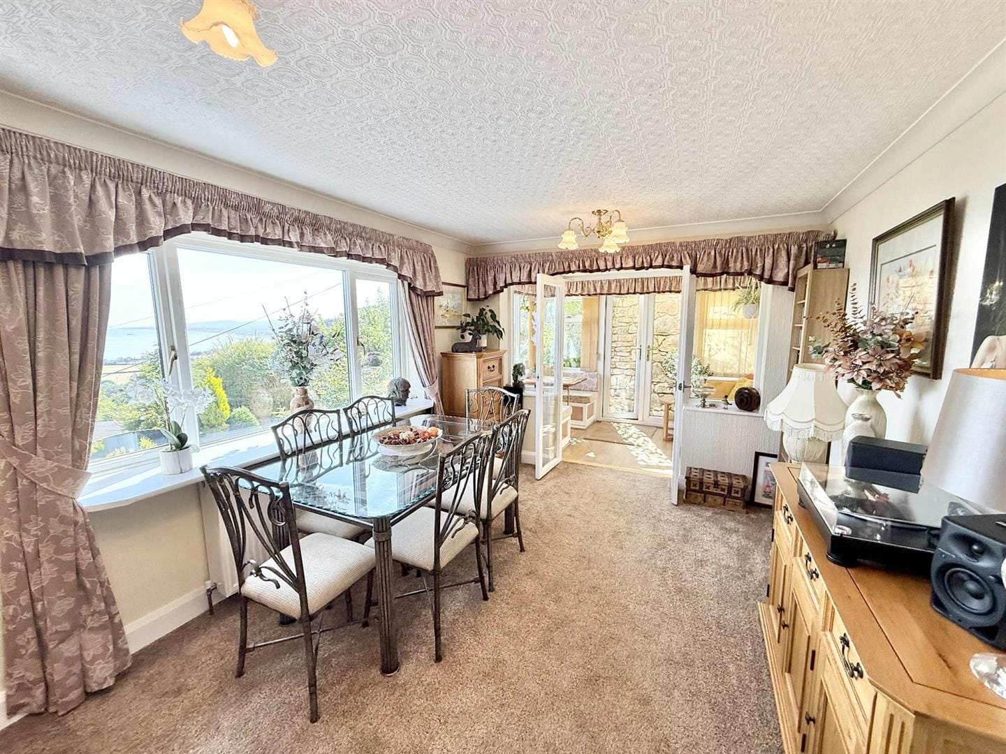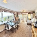 Upstairs, the spacious open-plan living and dining area creates a warm and sociable atmosphere, with a cosy log-burning stove at its heart and a wide opening to the kitchen—ideal for entertaining. The kitchen is well-equipped with a range of wall and base units, integrated appliances including an oven, grill, and dishwasher, and two large skylights that flood the space with light. The dining area enjoys panoramic sea views and flows seamlessly into a charming sunroom—perfect for morning coffee or quiet reading—with doors opening onto the rear garden.