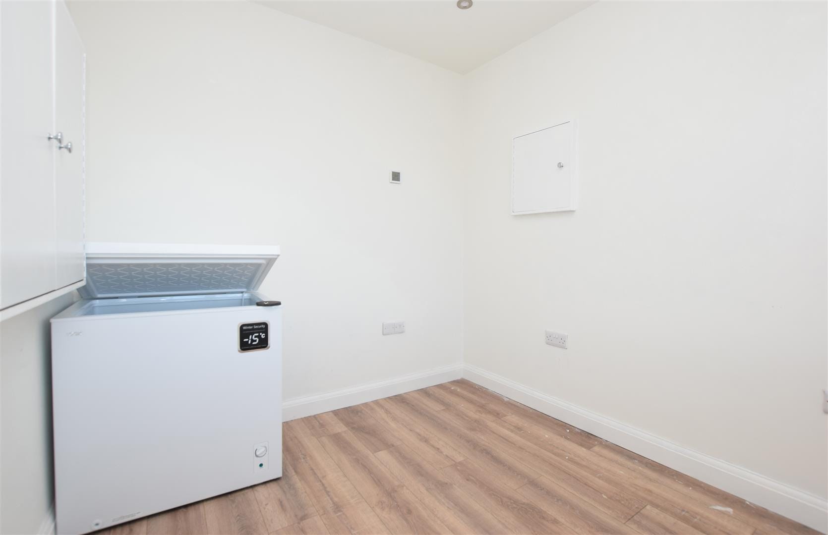 A contemporary composite front door, framed by glazed side panels, opens into a welcoming entrance vestibule laid with stylish wood-effect laminate flooring. From here, a converted garage offers a versatile space — ideal as a home office, hobby room, or for additional appliance storage, housing the utility meters and electrical consumer unit.