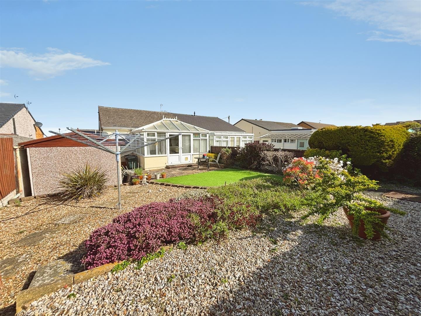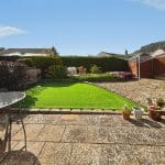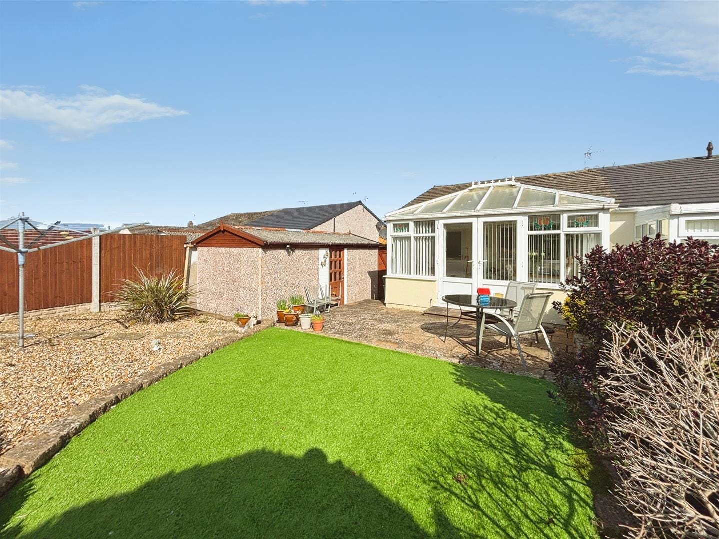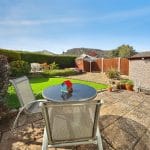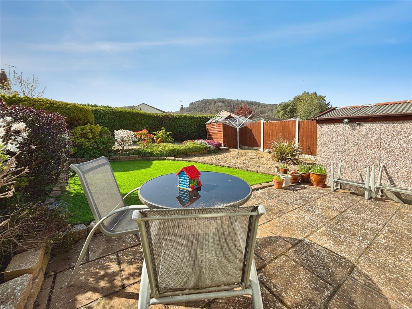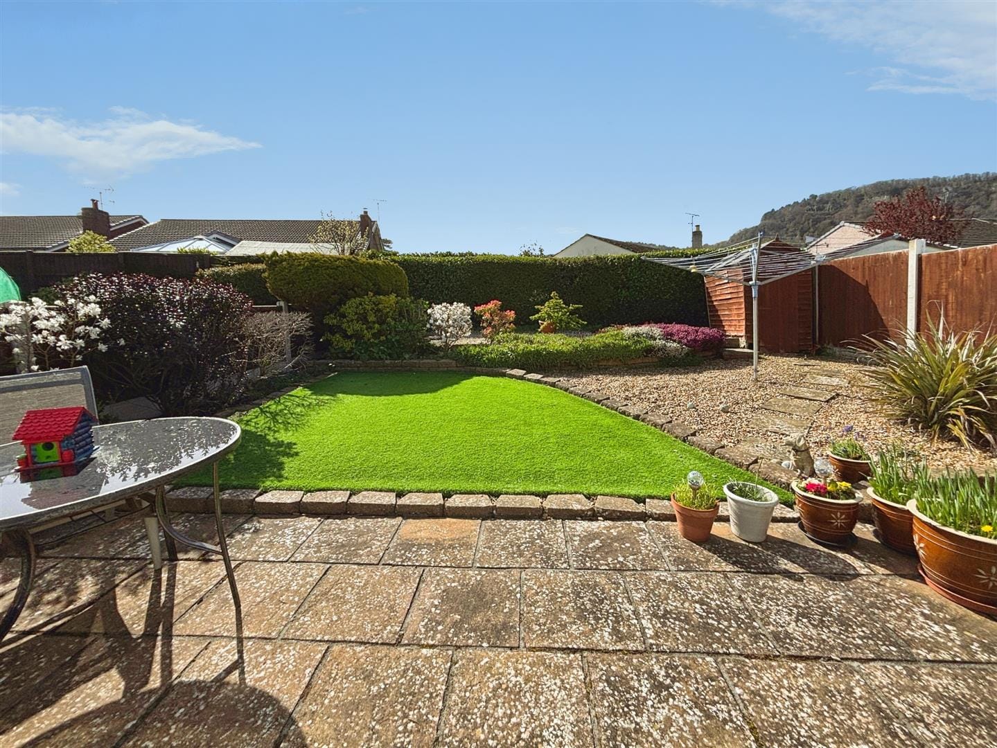 Externally, the south-facing rear garden is a true highlight, enjoying sunshine throughout the day and offering a lovely outlook towards the surrounding woodland. Thoughtfully arranged into three distinct areas, it includes a paved patio ideal for outdoor seating, a neat section of artificial turf, and stone-chipped areas incorporating flower beds. A well-established hedge and timber fencing provide privacy, while there is space for a timber shed. The garden also offers access to the garage via a side door, along with gated access to the driveway.
