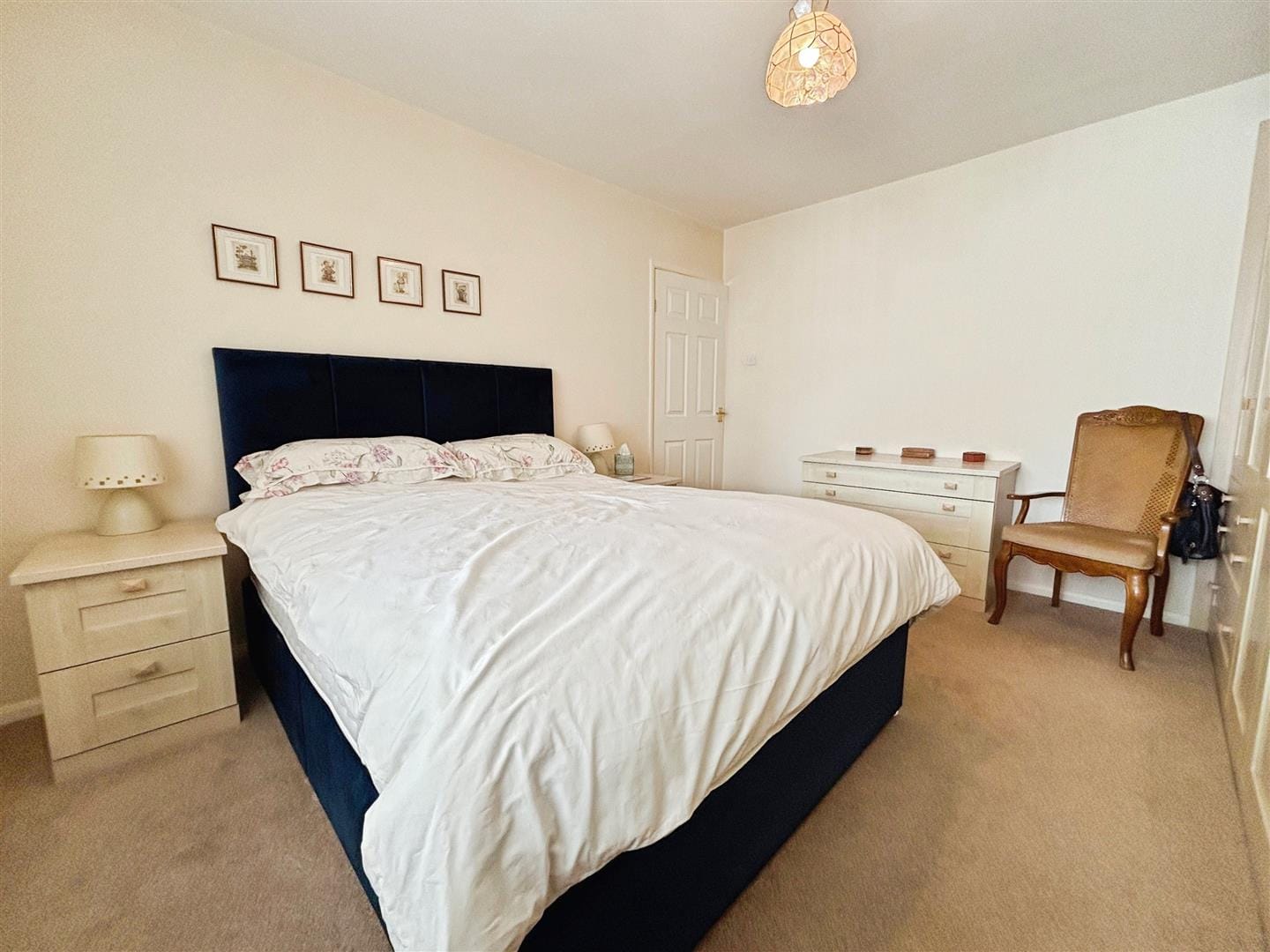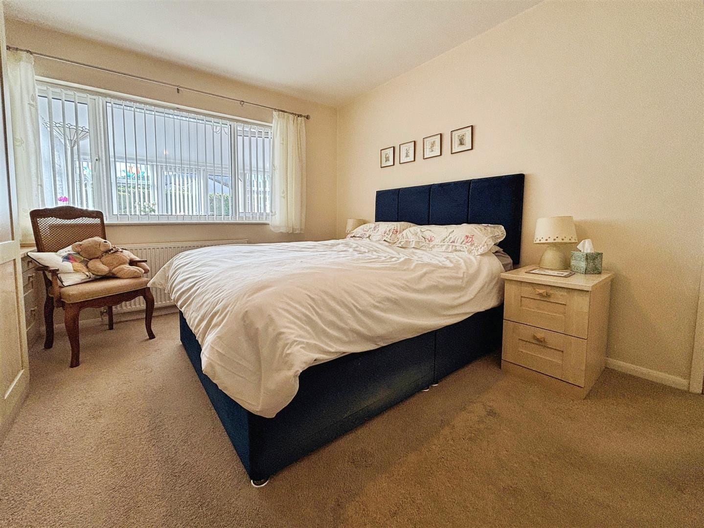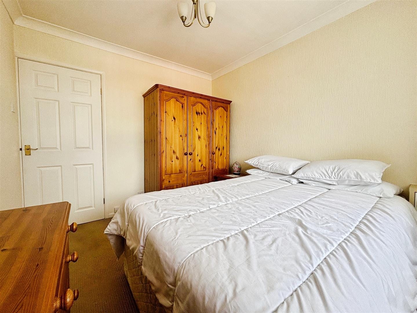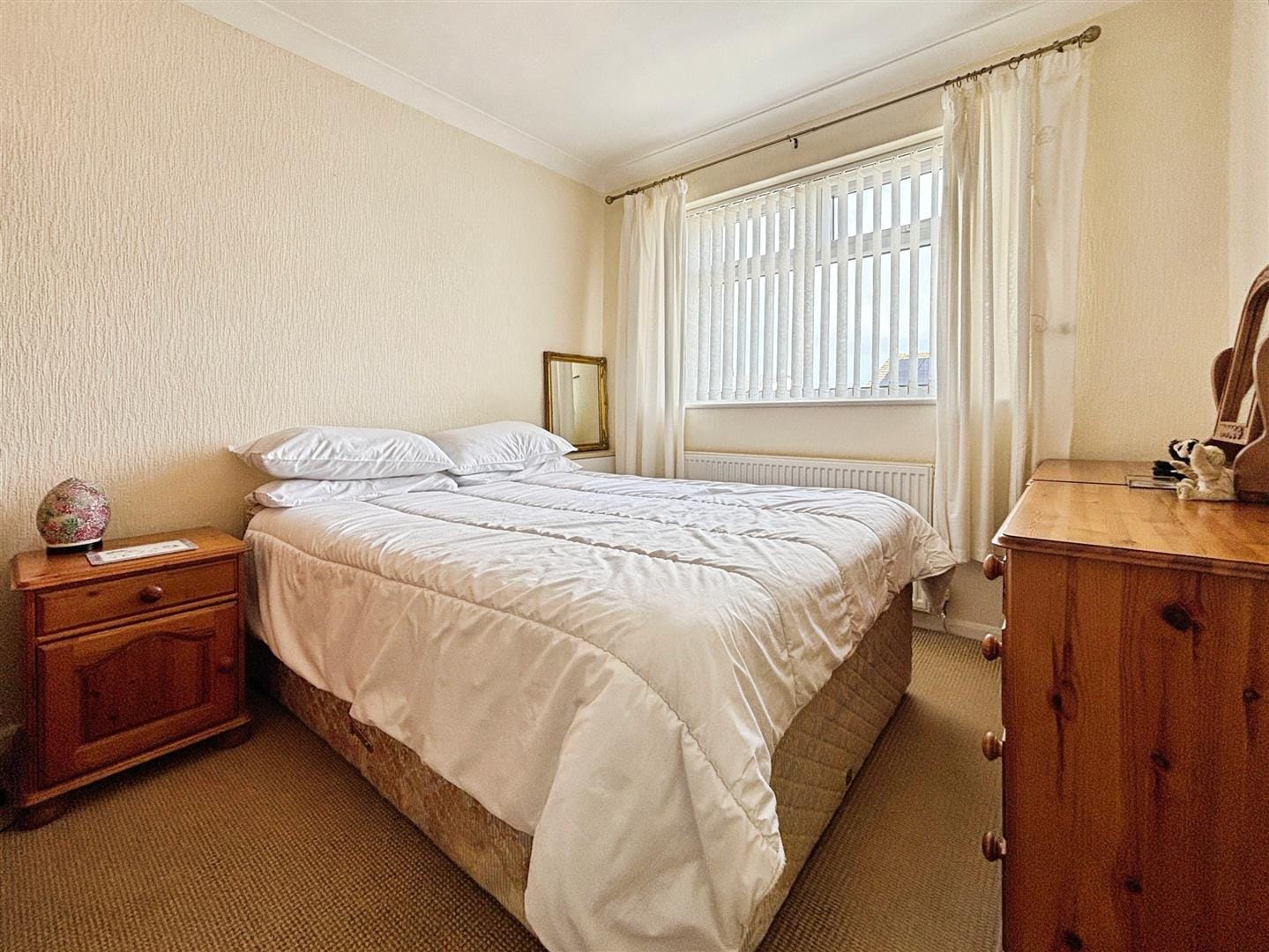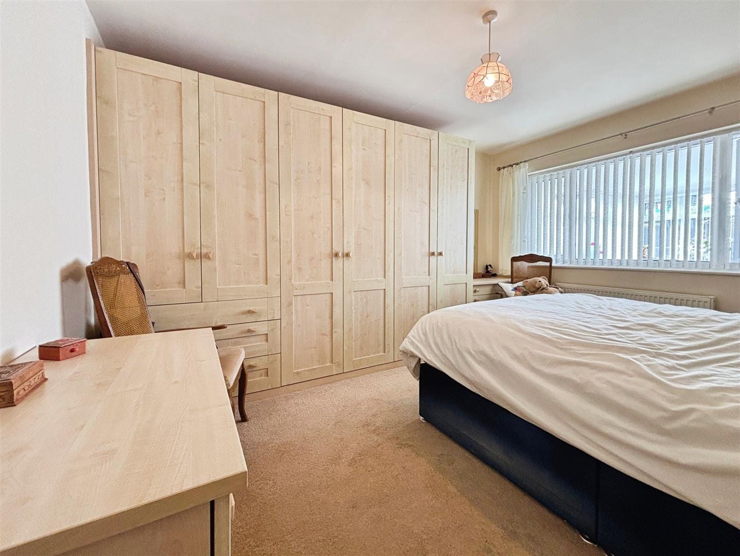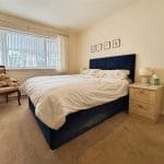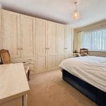 Both bedrooms are well-proportioned doubles. The primary bedroom benefits from an extensive range of fitted wardrobes and drawers, offering excellent storage while maintaining a clean and uncluttered feel. The second bedroom is equally bright and spacious, with room for freestanding furniture and enhanced by coved ceilings.