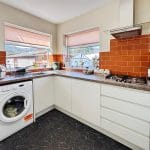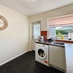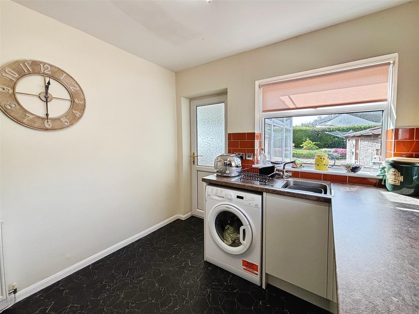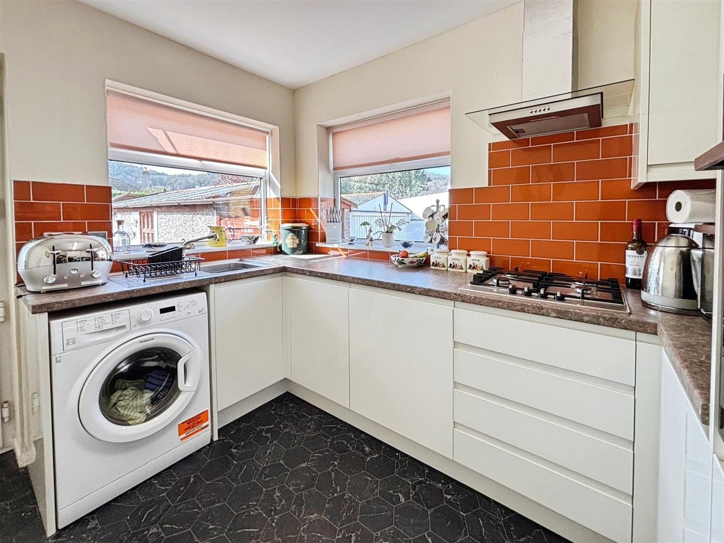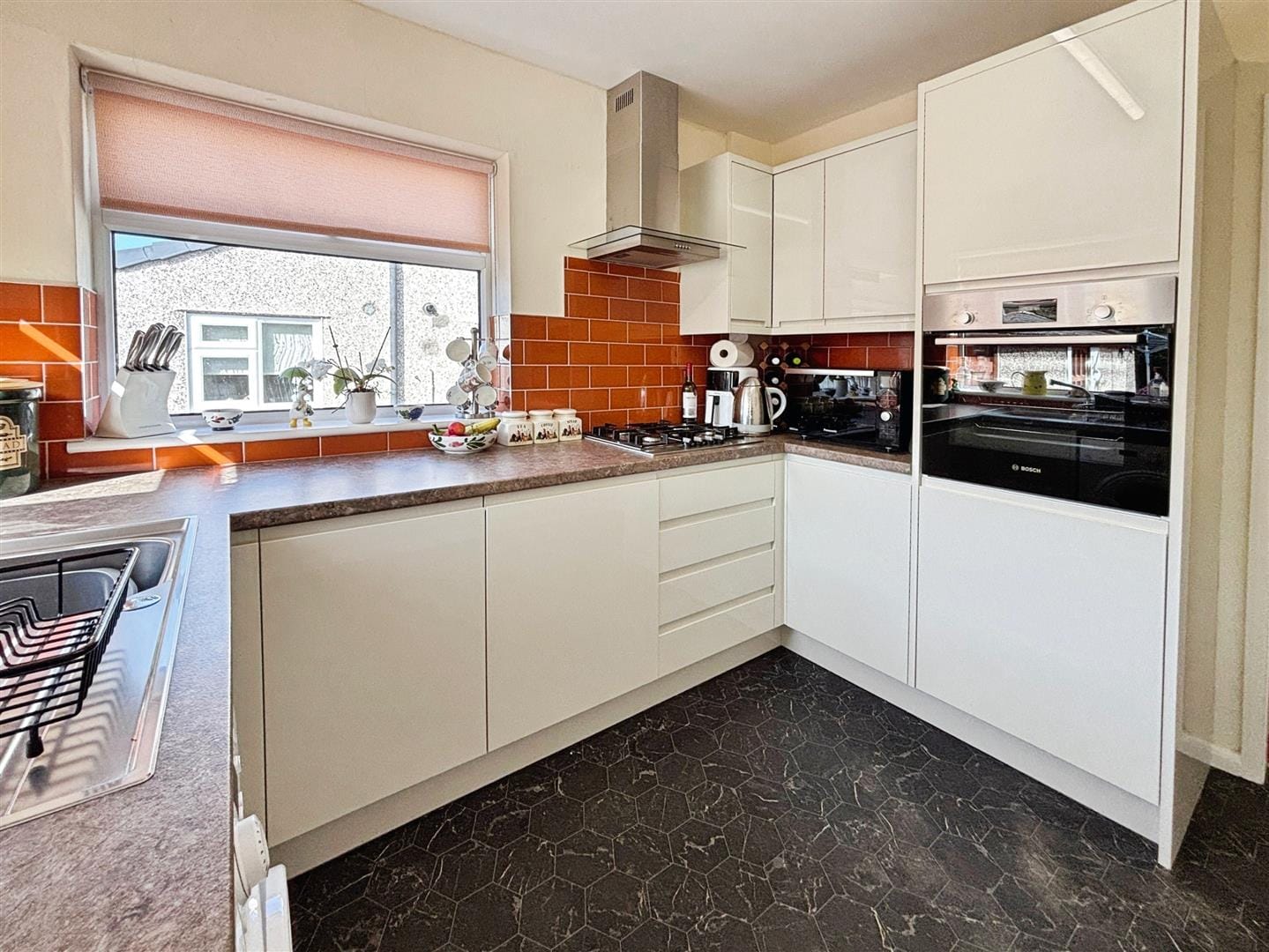 The kitchen has been tastefully updated, featuring sleek high-gloss handleless cabinetry paired with a stylish brick-effect tiled splashback. Dual-aspect windows allow plenty of natural light while framing delightful views towards Coed y Gopa woodland. Integrated appliances include an oven, gas hob and under-counter fridge, with plumbing available for a washing machine. A PVC door leads through to the conservatory.