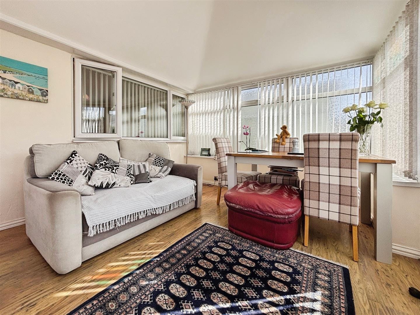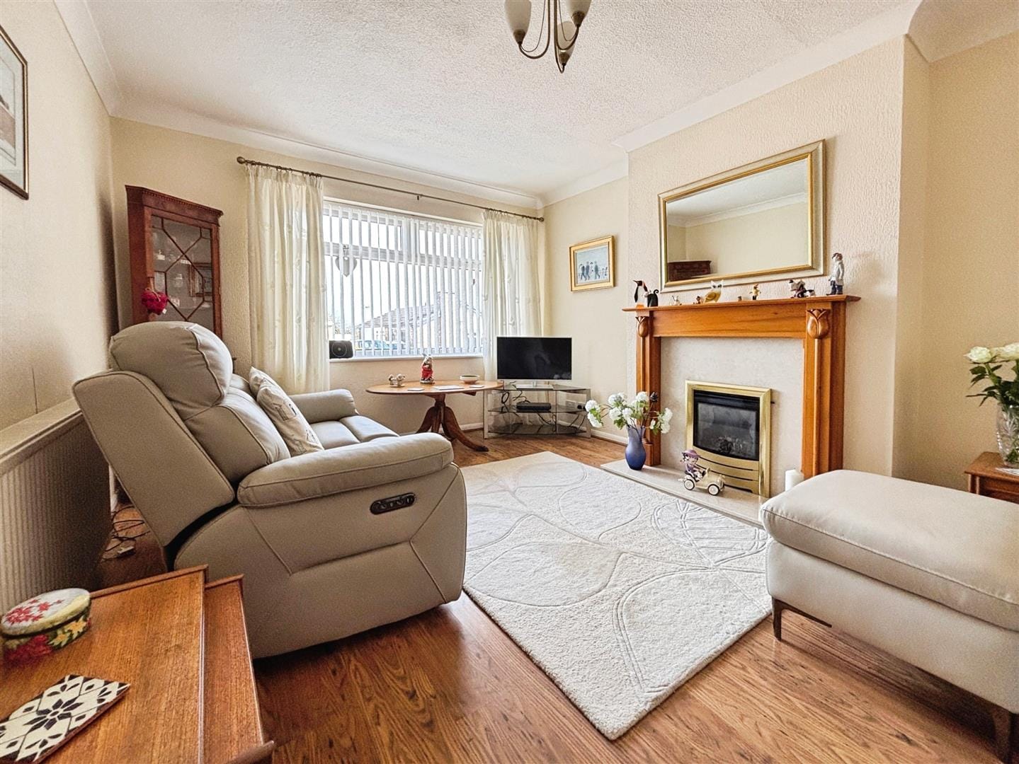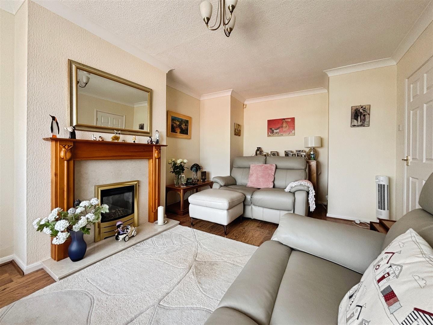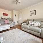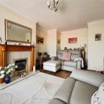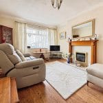 The lounge is a bright and inviting space, finished with wood-effect laminate flooring and complemented by coved ceilings. A charming Art Deco-style fireplace with a stone surround and gas fire creates an attractive focal point, while the room offers ample space for comfortable seating and furnishings.