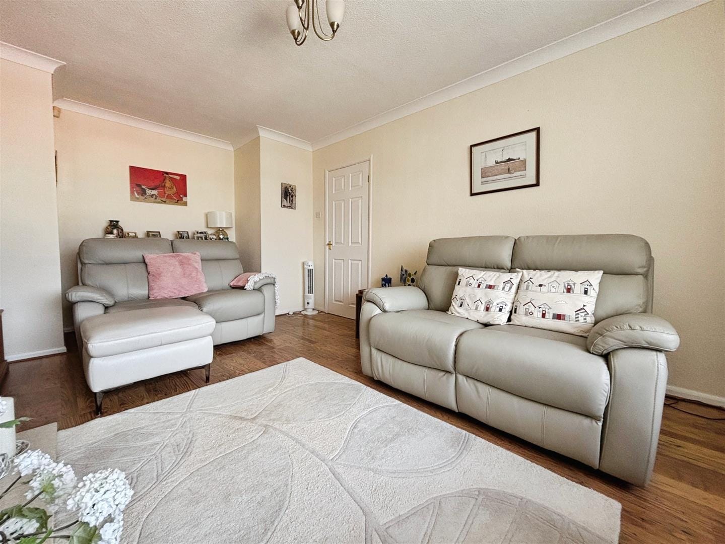 Approached via a low-maintenance front garden laid with stone chippings and dotted with potted plants, the property also benefits from a hardstanding driveway providing ample off-road parking and leading to a single garage. Timber steps rise to the PVC front door, opening into a welcoming L-shaped hallway. Here, a useful storage cupboard and access to the fully boarded loft, complete with lighting and a drop-down ladder add excellent practicality.