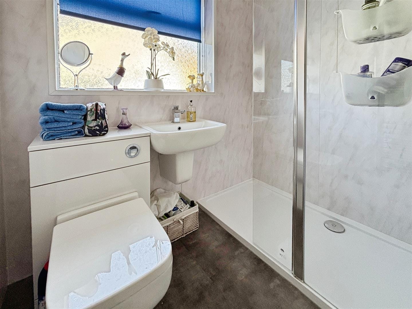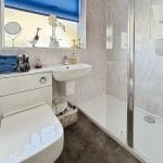 The bathroom has been modernised to a high standard, featuring low-maintenance PVC panelled walls, a contemporary WC and wash basin, and a large walk-in shower cubicle complete with a rainfall shower head and separate handheld attachment. A chrome heated towel rail completes the space.