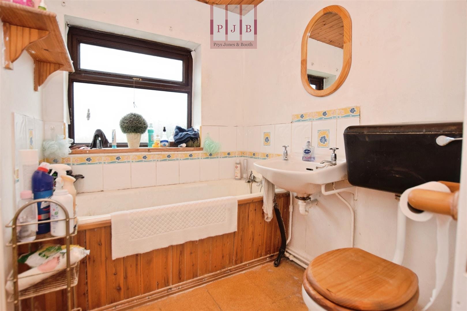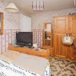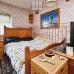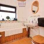 The bathroom currently comprises a cast iron bath, hand wash basin and WC, along with a timber-clad ceiling and a handy linen cupboard for storage. It should be noted that the fittings may contain asbestos, and buyers are advised to undertake appropriate checks as part of the conveyancing process.