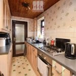 - Galley-style kitchen with integrated oven and gas hob