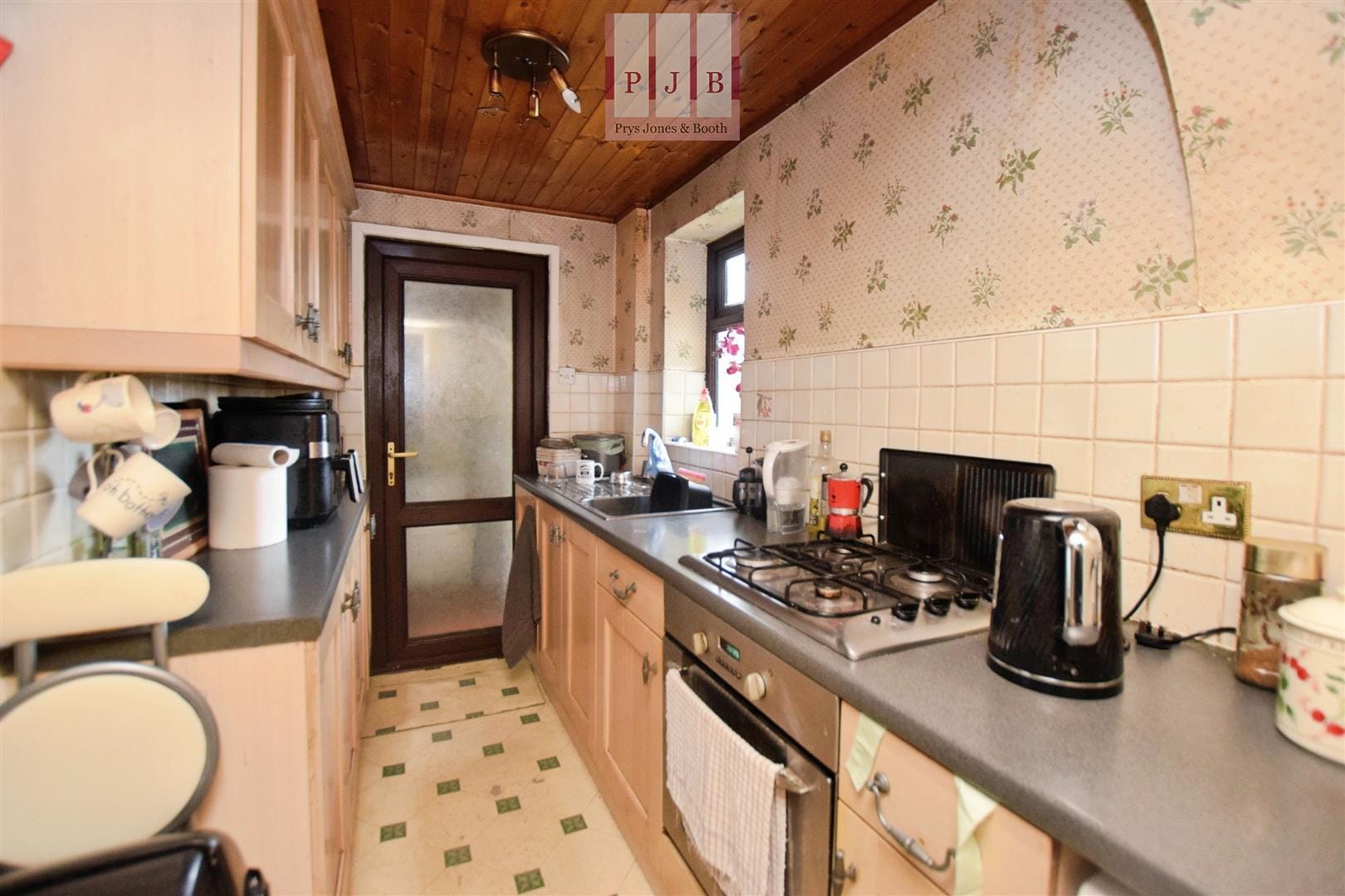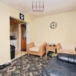 The kitchen is arranged in a practical galley layout and is fitted with shaker-style wall and base units, finished by tiled splashbacks and vinyl flooring. Integrated appliances include an electric oven and four-ring gas hob. The kitchen remains open to the second reception room, creating a sociable atmosphere.