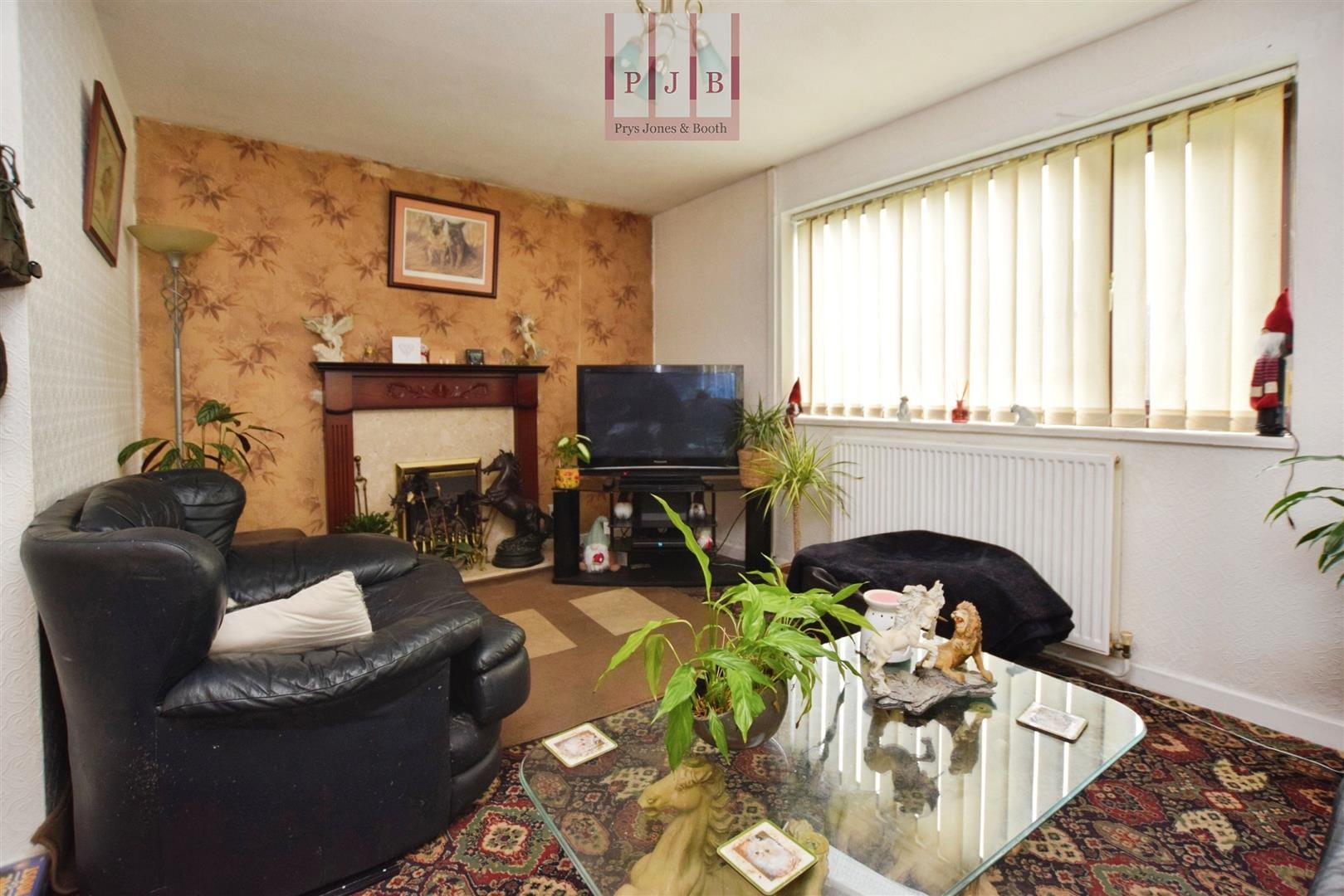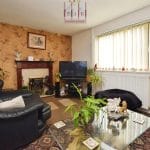 The lounge is a well-proportioned and inviting room, benefiting from dual-aspect windows that allow natural light to flow throughout the space. A traditional fireplace with timber mantel and stone surround forms the focal point of the room, housing a gas fire which is currently decommissioned but retains its character as a feature.