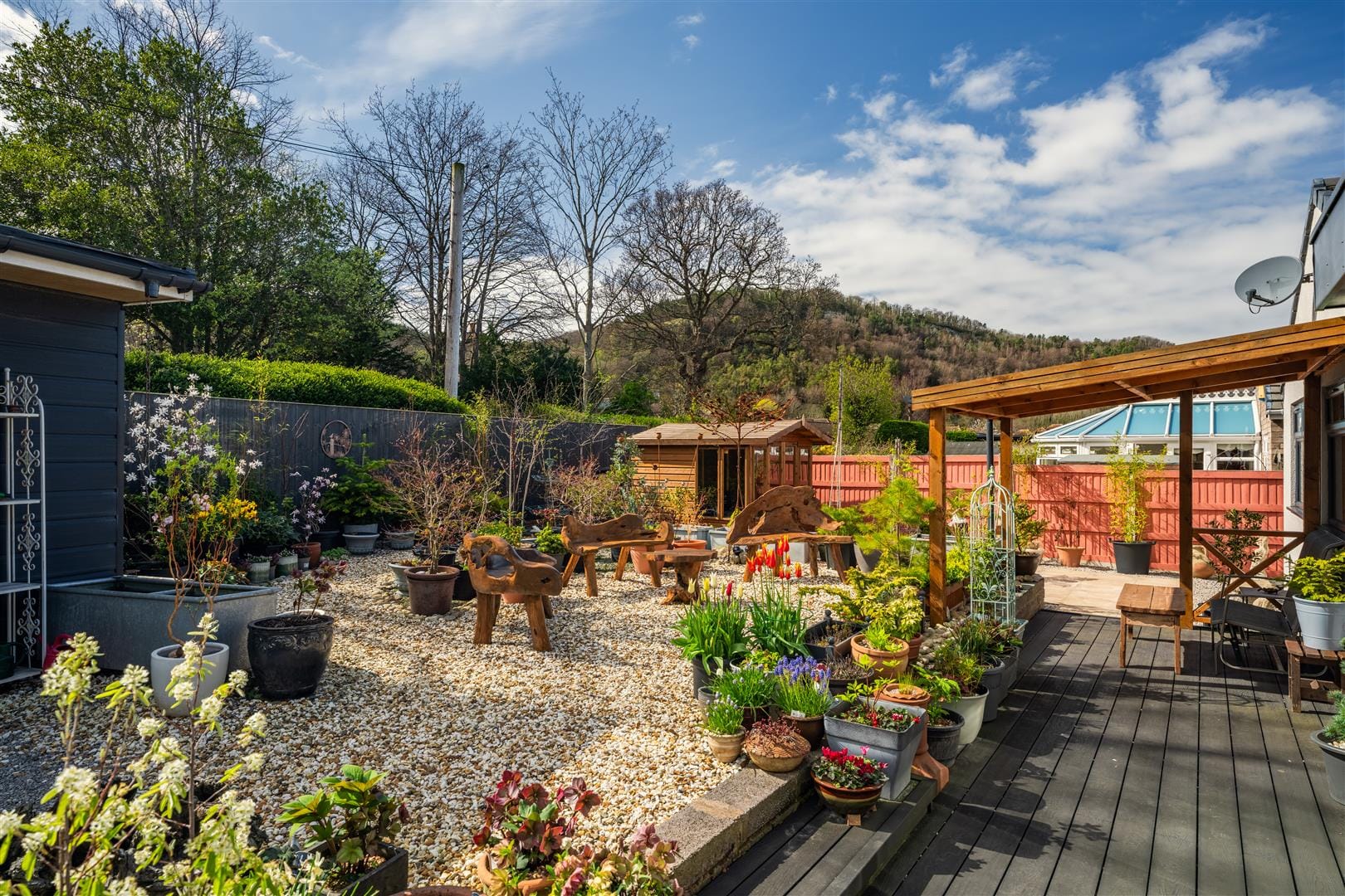 Outside, the rear garden is a true suntrap, enjoying a favourable aspect and designed for low maintenance with a combination of composite decking, stone paving, and decorative pebbled areas. A charming pergola provides a peaceful seating area, while high timber fencing and mature hedging ensure privacy. Beyond, you can enjoy picturesque views towards Tan y Gopa Woods. The garden also features a Summer house, a well-positioned garden/potting shed with exciting potential and repurpose opportunity, and practical additions such as an outdoor tap and power socket. Wrapping around to the front, the garden offers further space and gated access.
