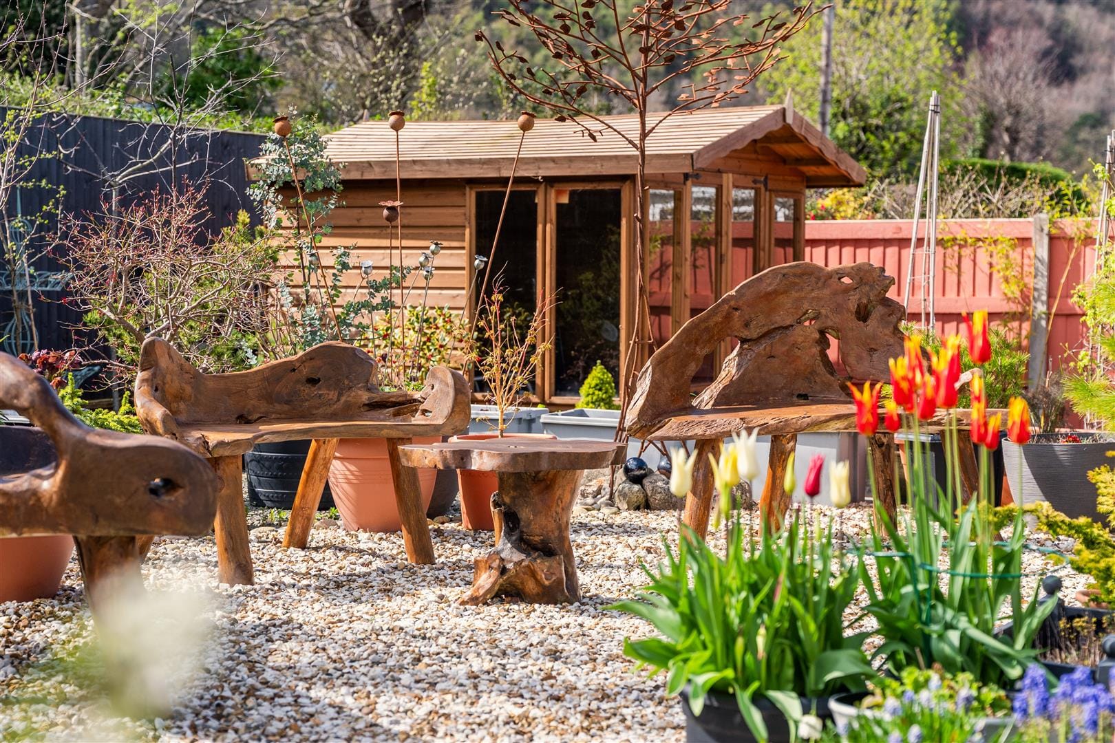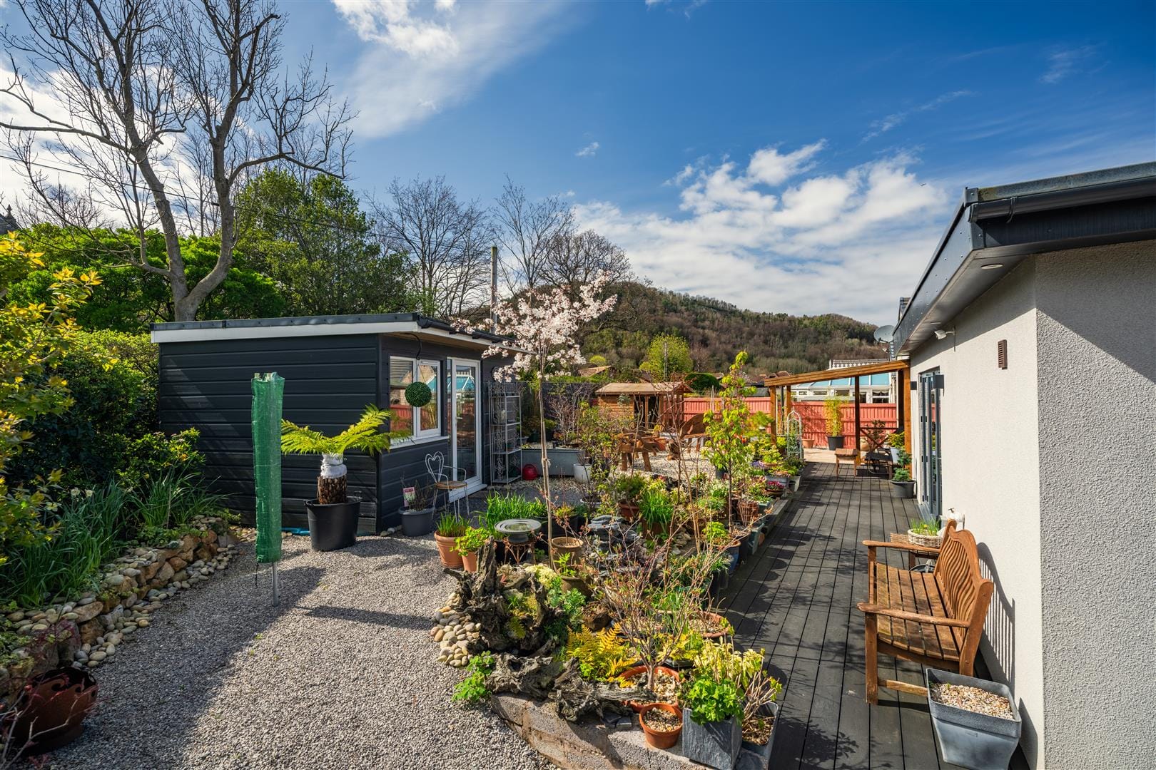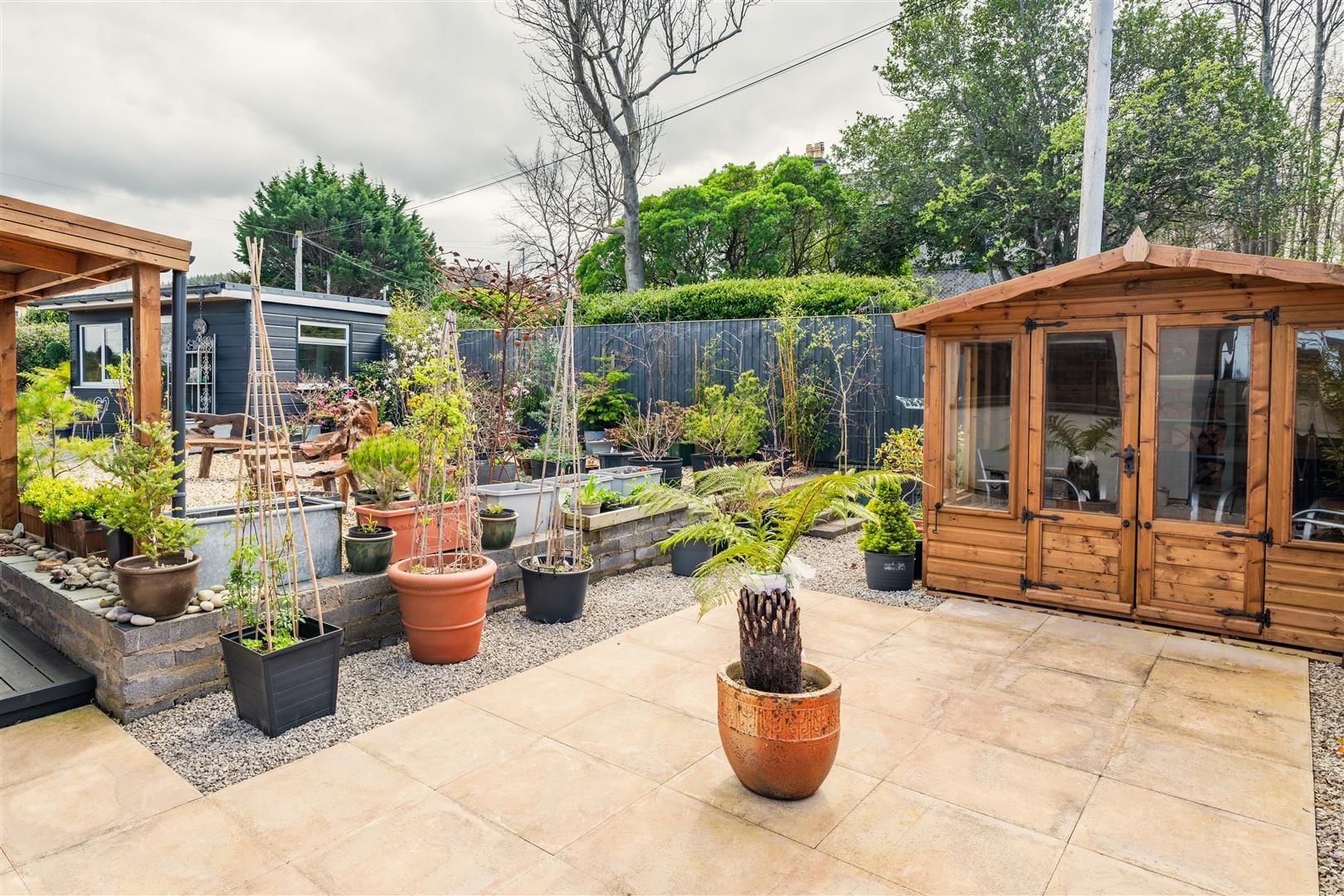 - Private, low-maintenance garden with pergola, shed, and summer house