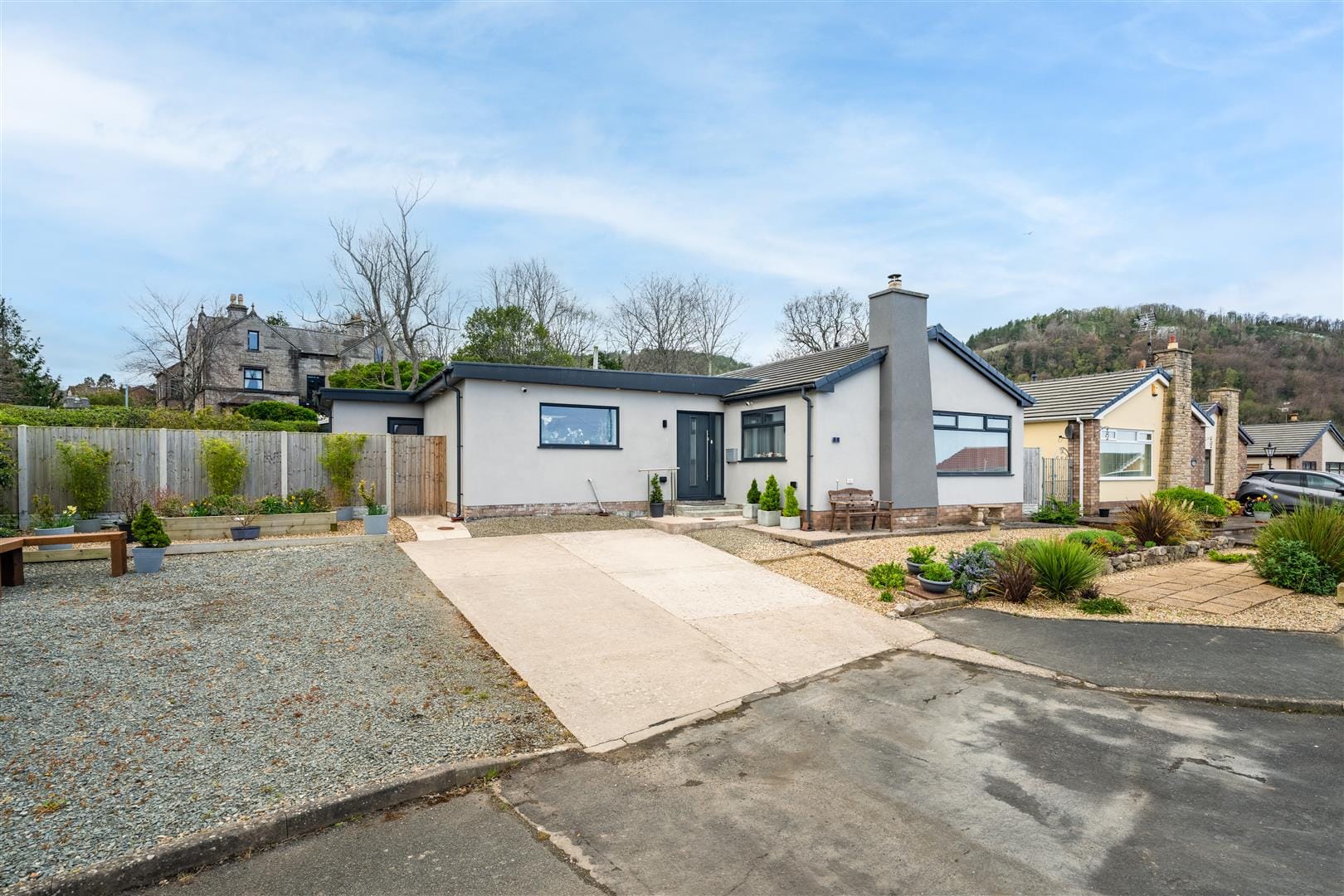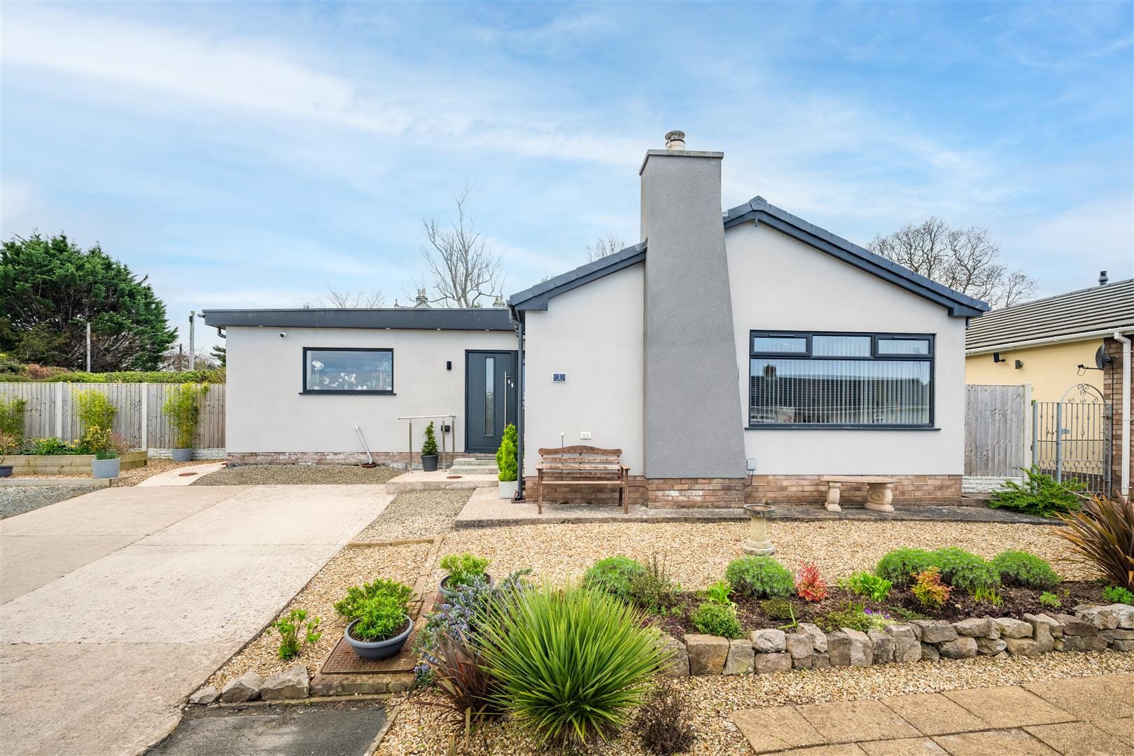 From the moment you arrive, the property makes a striking impression, with a generous hardstanding driveway providing space for two vehicles, flanked by attractive pebble-dash frontage with pockets for planting and potential to extend the parking further if desired. There are also outside power sockets located here for convenience