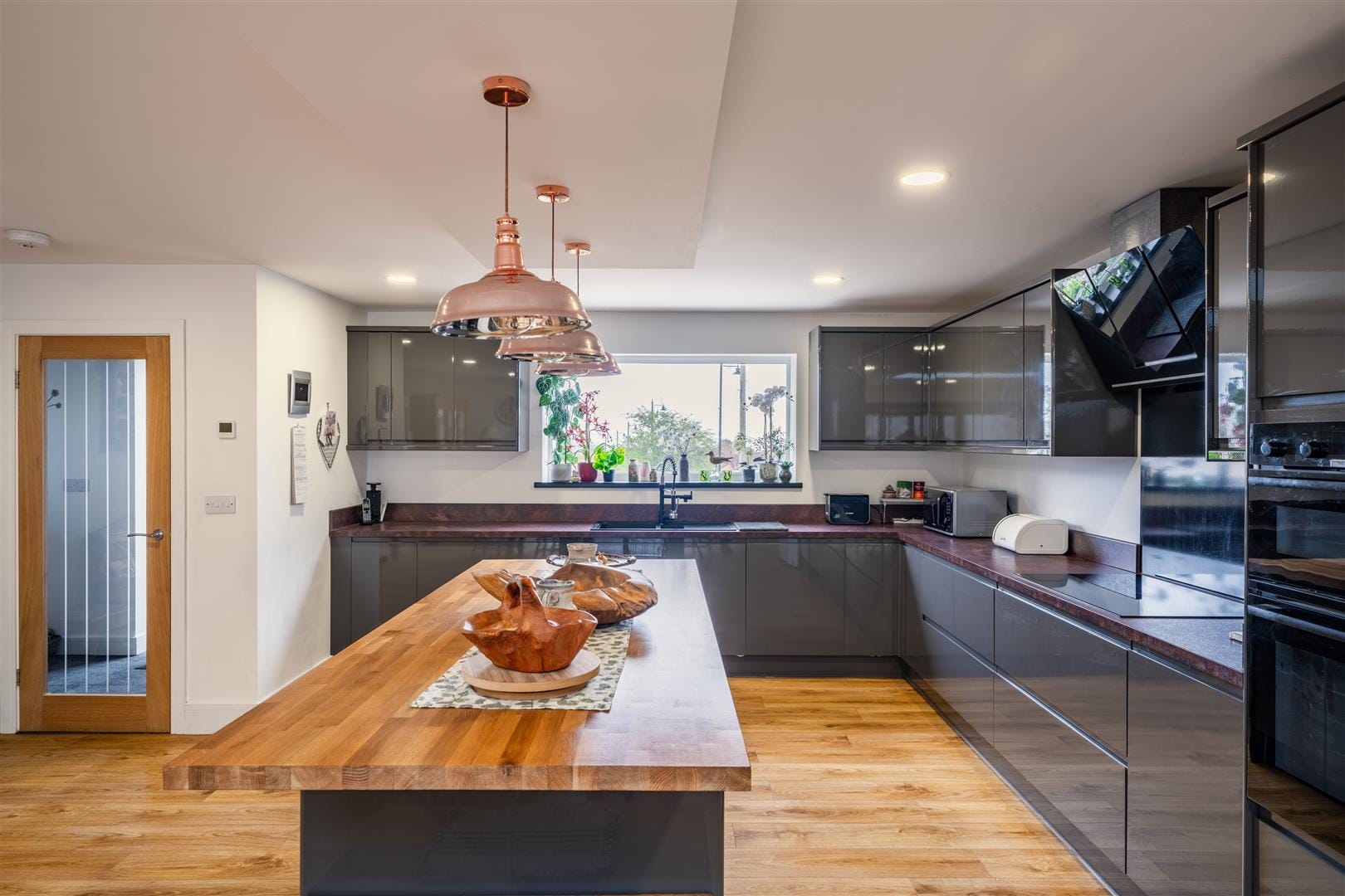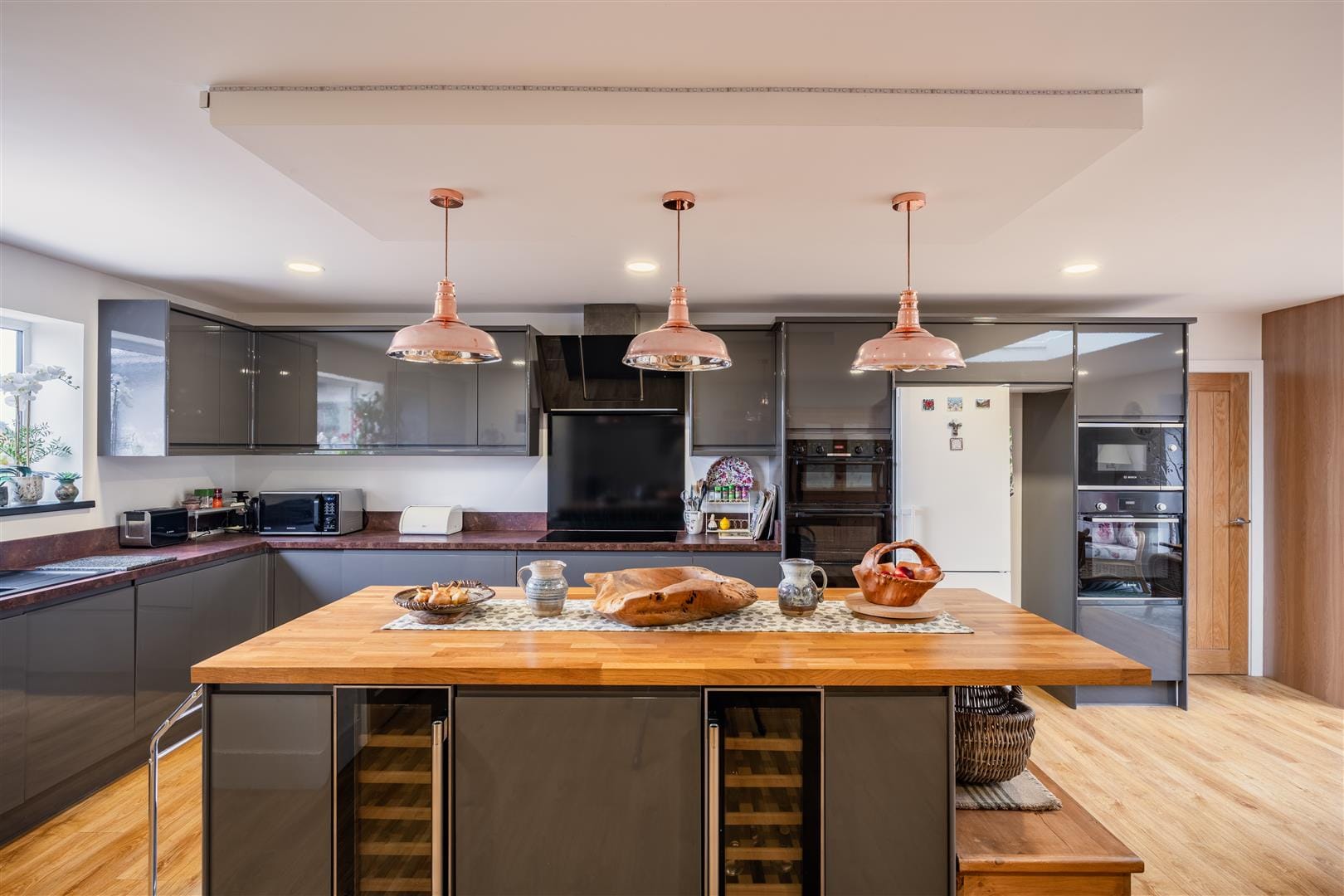 To the rear, the home opens into a beautifully extended kitchen-diner, designed for modern living and entertaining. Beneath the oak-effect laminate flooring lies electric underfloor heating, ensuring comfort year-round. A central island provides additional storage and houses two wine coolers, while sleek soft-close cabinetry, an induction hob, three integrated electric ovens, Integrated microwave and an integrated dishwasher complete the space. There is also room for an American-style fridge freezer. Natural light floods in through a skylight, while bi-fold doors open seamlessly onto the garden, creating a wonderful indoor-outdoor connection. The extension also benefits from a durable rubber roof with a 30-year guarantee.