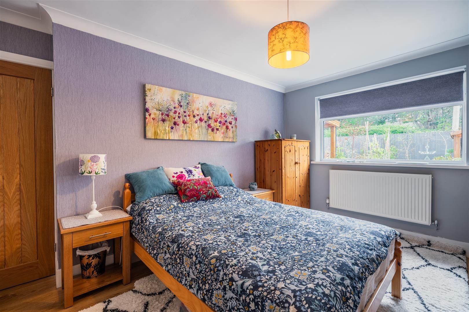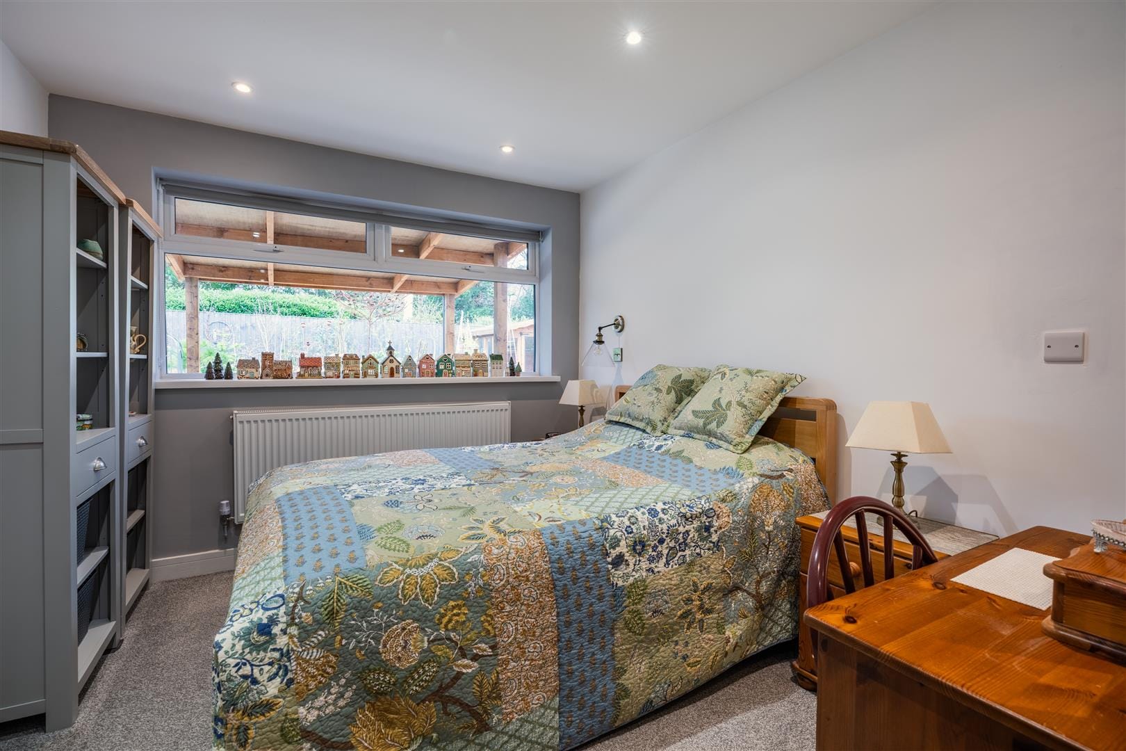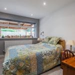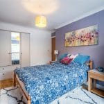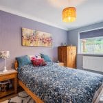 Both bedrooms are generously proportioned and beautifully presented. The second bedroom is bright and airy, with space for a double bed alongside a fitted wardrobe and furniture, enjoying pleasant garden views. The main bedroom is uniquely shaped, offering flexible space for a double or king-size bed, with an additional area ideal for storage, dressing, or even a home office.