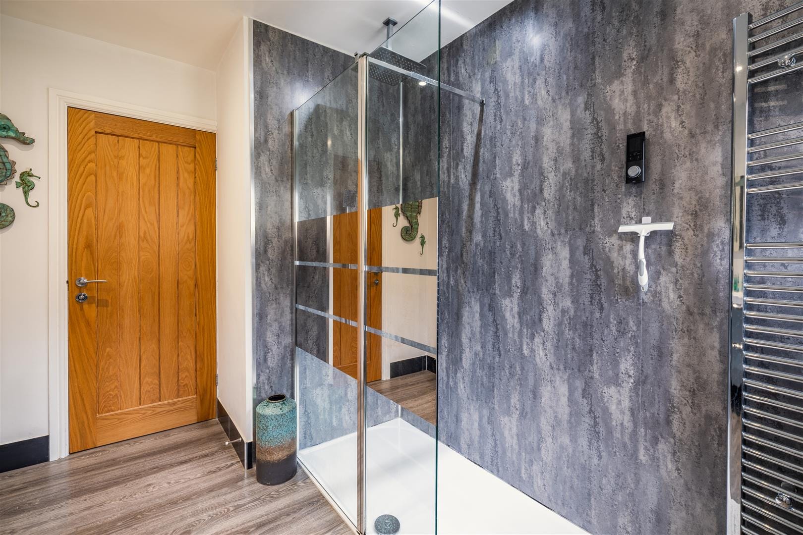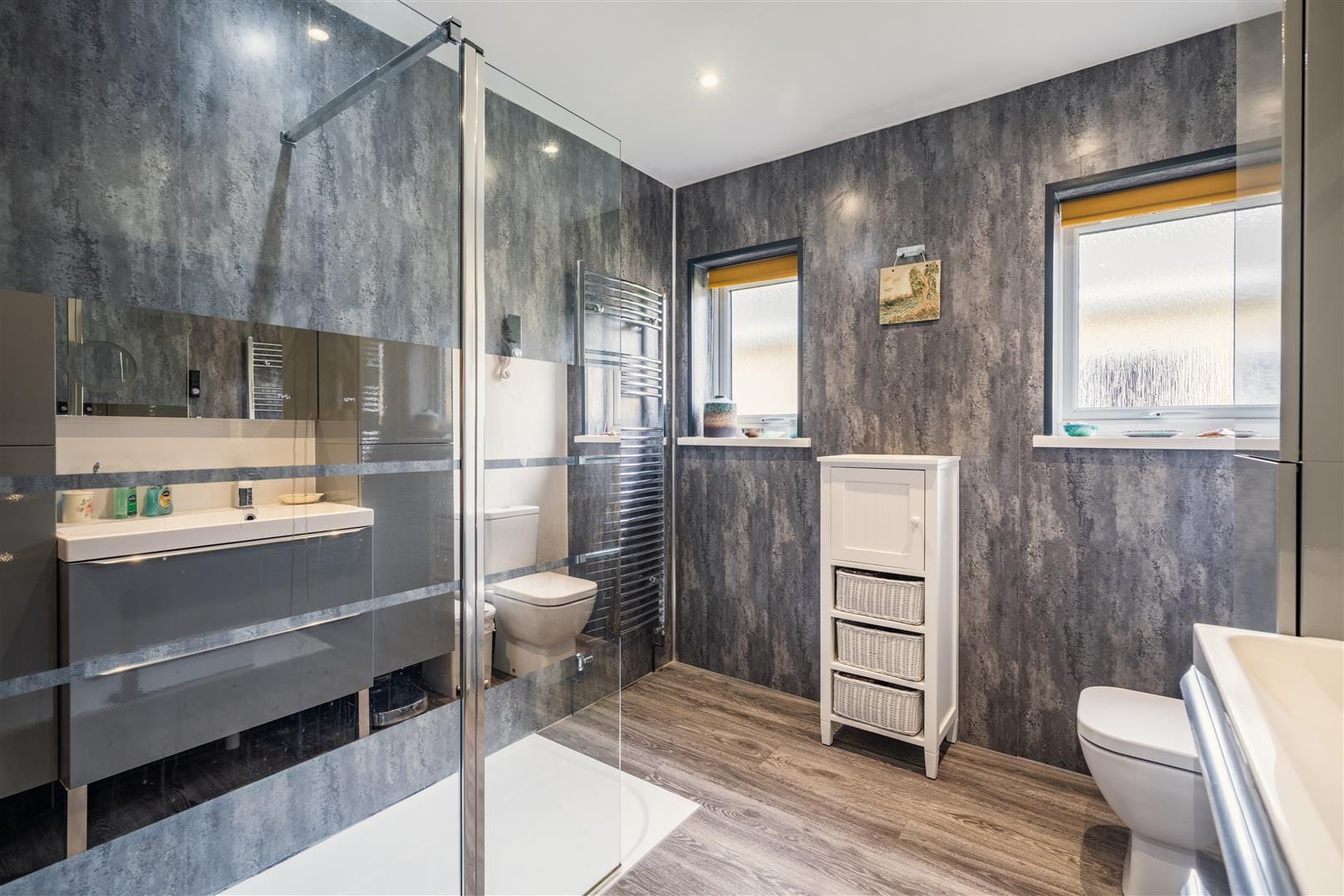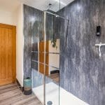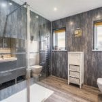 The bathroom is equally impressive, featuring a spacious walk-in shower with modern cladding and smart Wi-Fi controls, complemented by laminate flooring, a large wash basin with soft-close storage, and contemporary fittings.