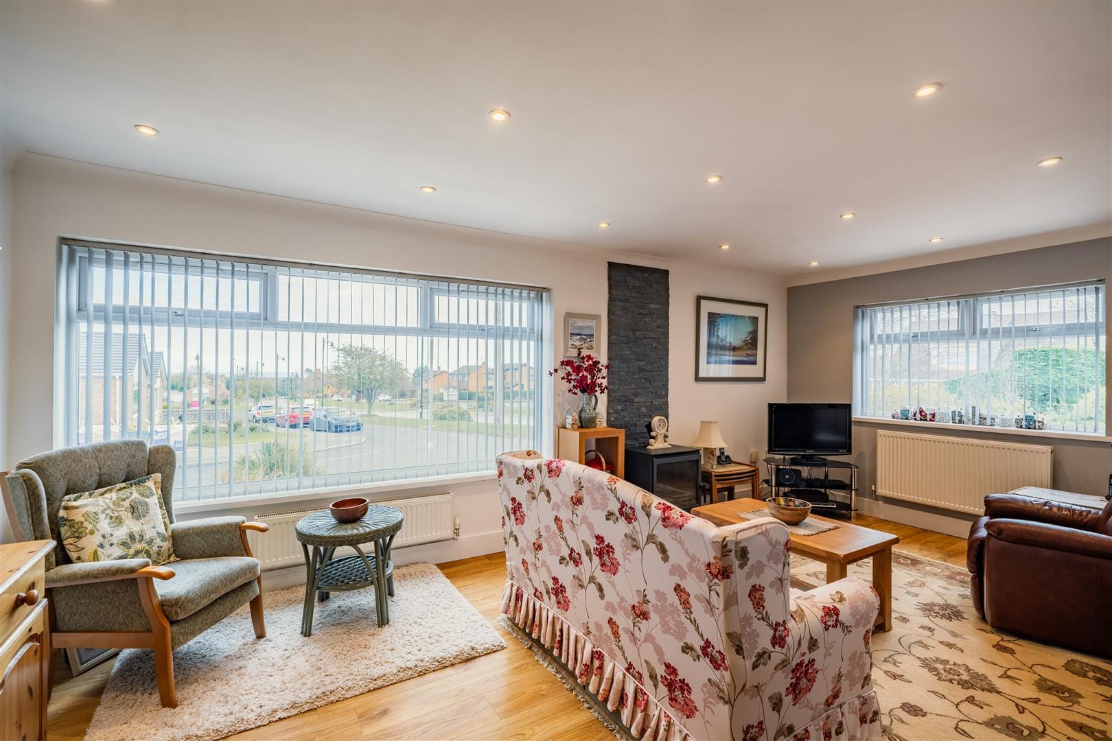 To the front of the property, the lounge is a standout feature, bathed in natural light from large windows that frame stunning sea views. This expansive L-shaped space offers incredible versatility, easily accommodating both living and dining areas or even a home office corner. At its heart sits a stylish log burner, set upon a sleek glass hearth with a tiled backdrop, while coved ceilings with inset spotlights add a refined finish.