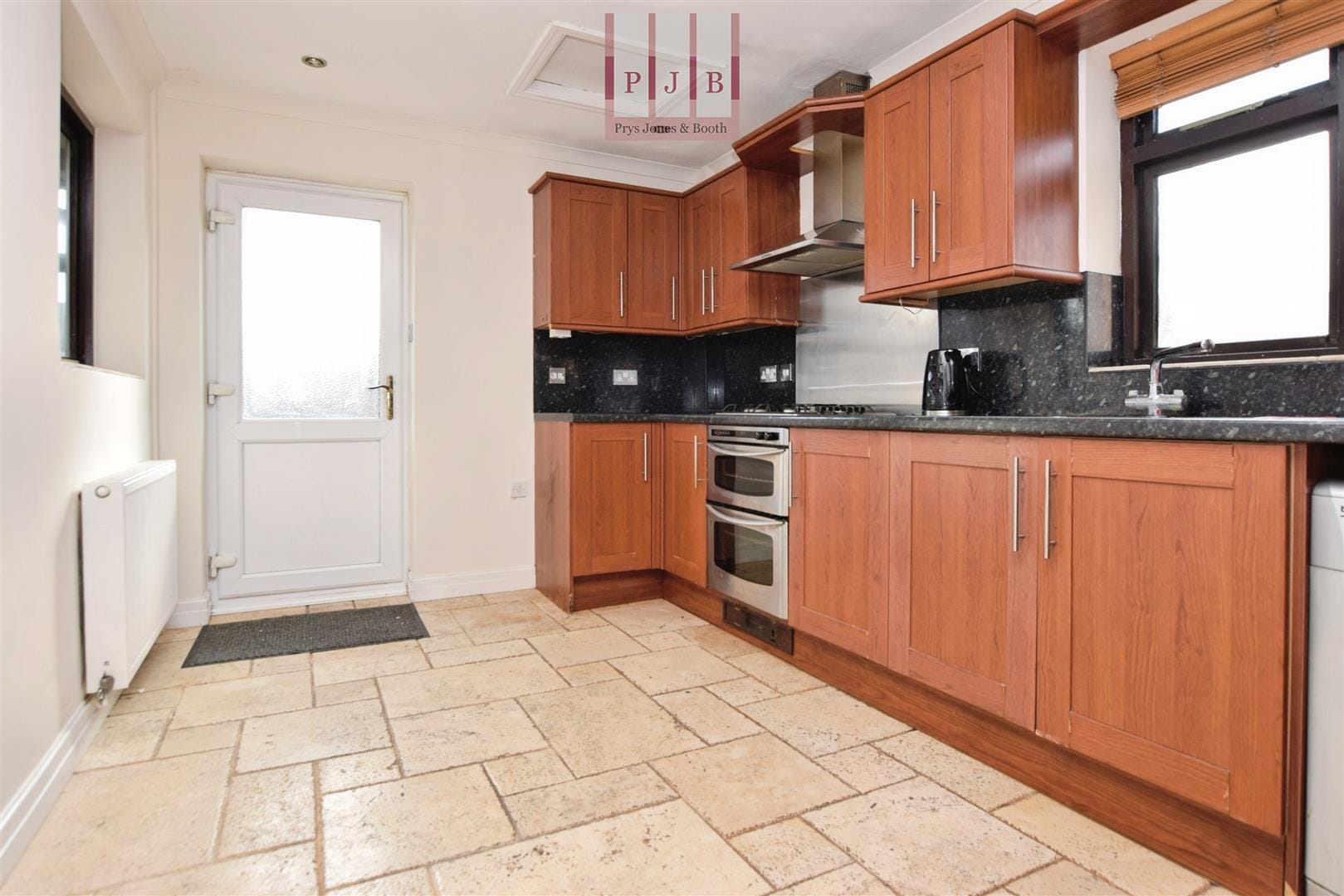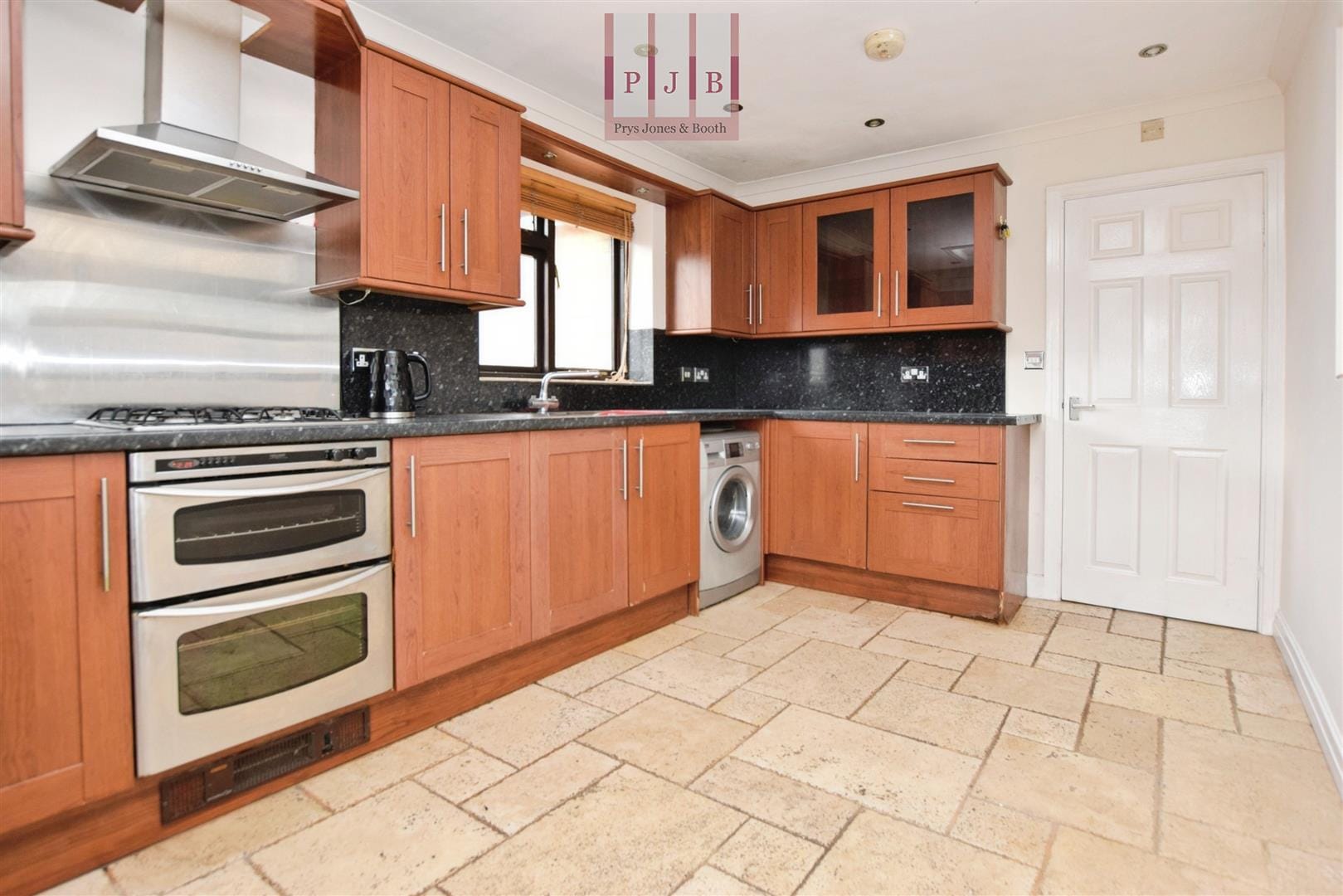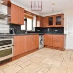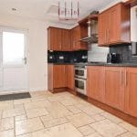 The kitchen is generously proportioned and fitted with a range of shaker-style wall and base units, tiled flooring and ample worktop space. Integrated appliances include a double gas oven and grill with gas hob, alongside plumbing for a washing machine and recessed ceiling lighting. A PVC door opens directly onto the rear garden, making outdoor dining and entertaining effortless.