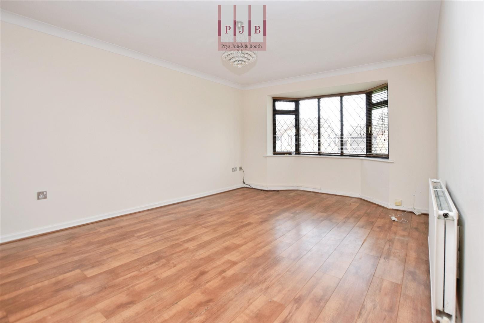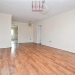 Wood-effect laminate flooring continues into the spacious open-plan lounge and dining area, where a bay window fills the room with natural light and creates a bright, relaxing atmosphere.