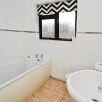 The main bathroom is finished with partially tiled walls and flooring, a bath with rainfall shower and separate handheld diverter, glass screen, WC, basin and chrome heated towel rail.