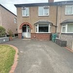 The property is approached via a hardstanding driveway with an attractive brick-paved border, providing generous off-road parking for multiple vehicles. To the side, a compact yet charming front garden features a neat patch of lawn and a rocky planted area dotted with mature greenery, adding a welcoming splash of colour.