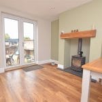 The lounge is bright and inviting, decorated in soft, contemporary tones. A large bay window with timber sills allows sunlight to pour in, while a multi-fuel burning stove sits proudly within a timber mantel and slate hearth — perfect for cosy evenings. Elegant coved ceilings add a refined touch.