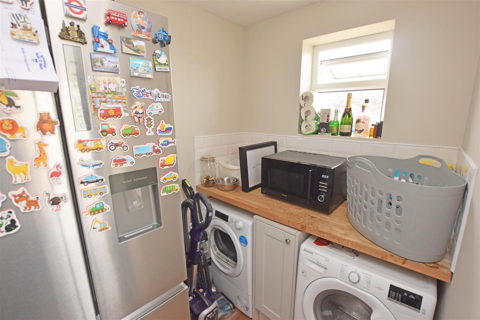 Off the kitchen, a useful utility room provides space for an American-style fridge freezer and has plumbing for both a washing machine and tumble dryer.