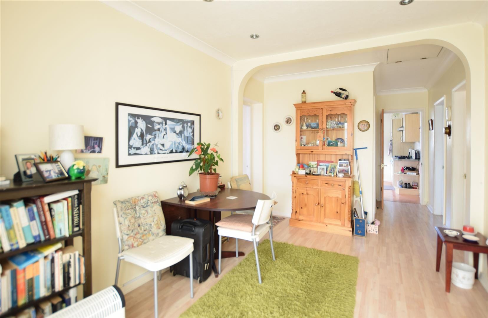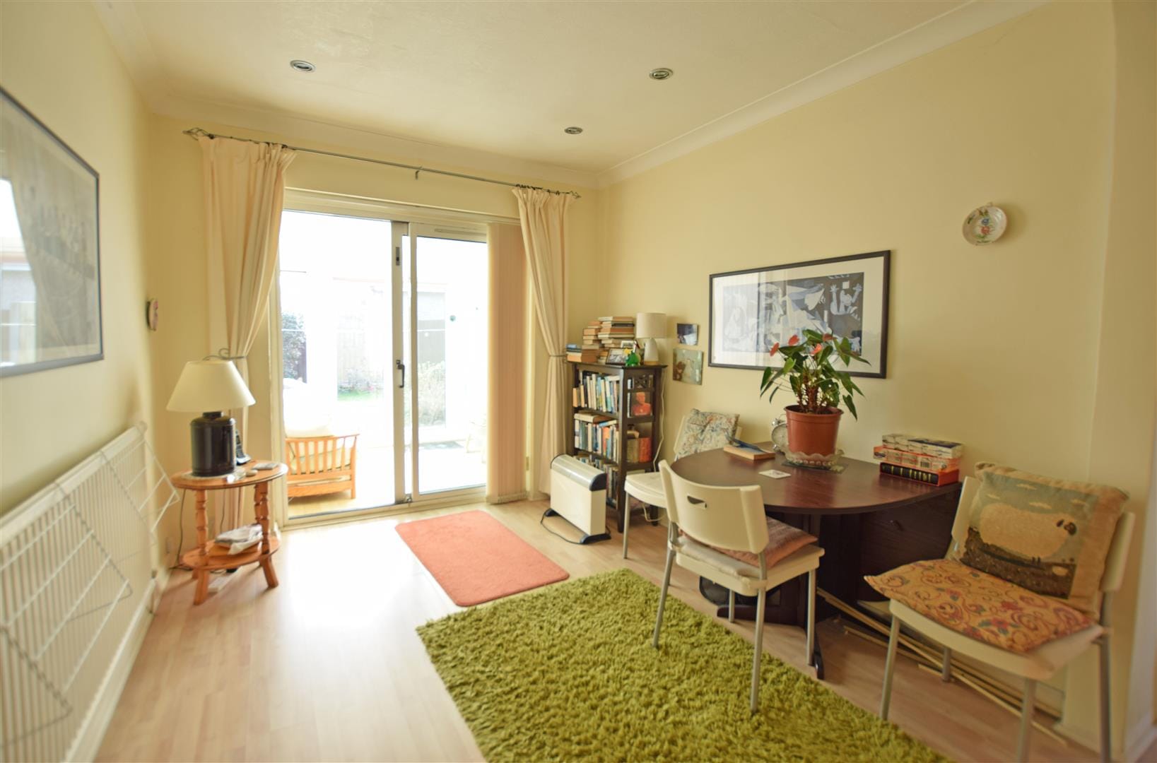 Beyond the lounge, an open hallway leads to a versatile second reception space. Previously the second bedroom, this open-plan area is perfect for use as a dining room, reading nook, or additional sitting area. Sliding doors provide a seamless flow into a large garden conservatory, which boasts panoramic views of the rear garden. French doors open onto the patio, inviting the outdoors in.