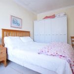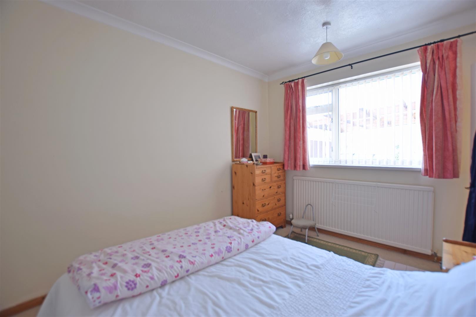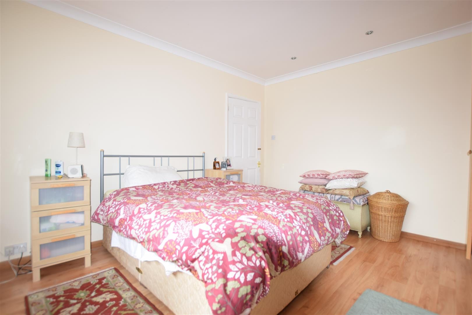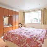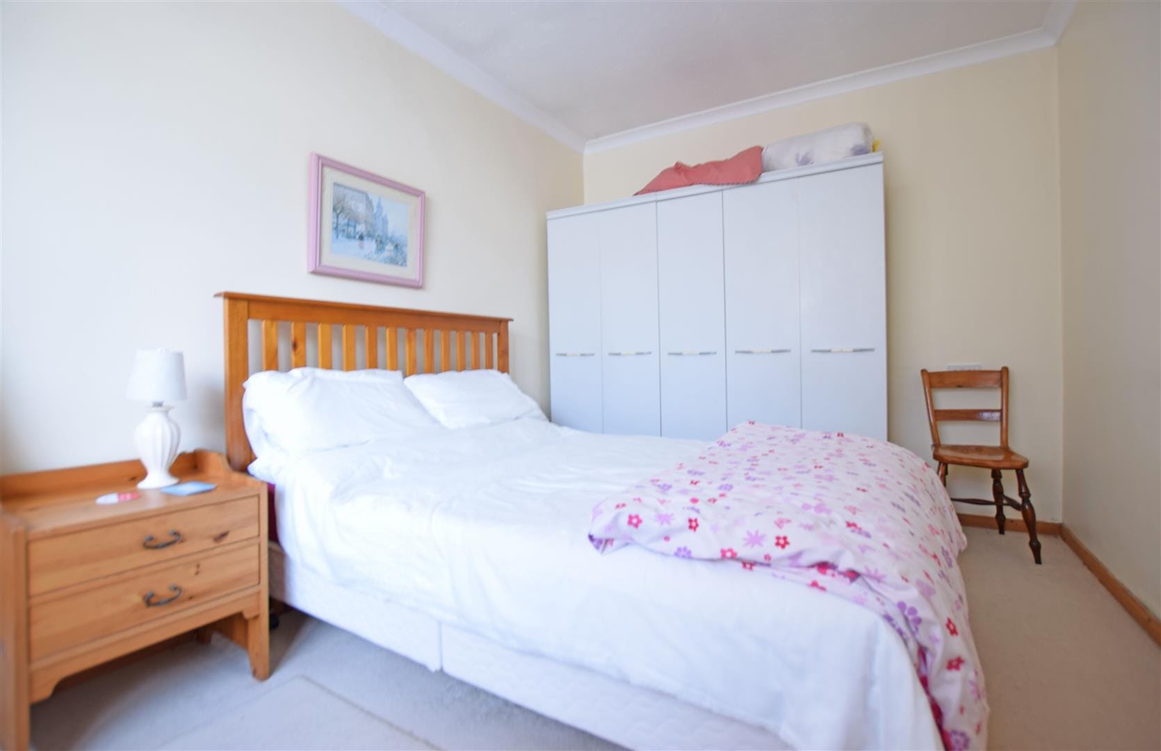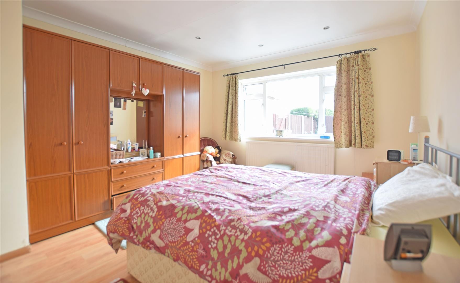 The primary bedroom is a spacious and peaceful space, laid with wood-effect laminate flooring and offering a pleasant view onto the rear garden, while there is plenty of room for a double bed, freestanding wardrobes, and a chest of drawers. A handy built-in cupboard with shelving provides additional storage for linens.